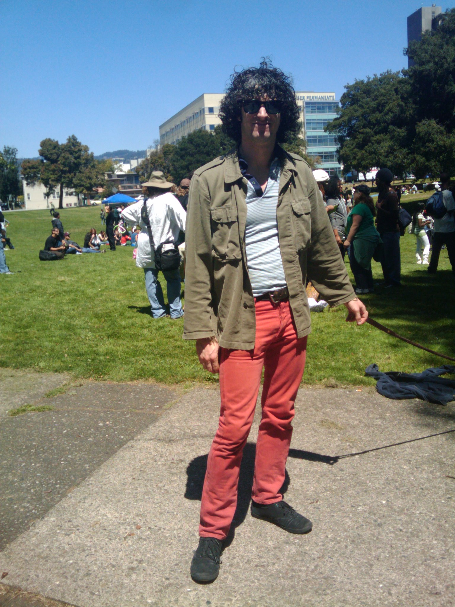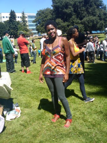 When, I saw her ensemble. I knew I had to take a picture. Her multi-colored tank paired with a skinny pant was a great idea. Her orange tie up sandals were perfect for the grass at Mosswood Park. The choice of gold- dangly earrings and owl inspired necklace worked very well. Anika is the Founder/ Director of SmashBox Contemporary. For more style at Frest Fest 2010 read on….