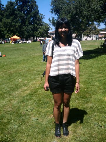 The woman above had great style. I like her hair style. Her flowy striped blouse paired with a classic black shorts and black boots were hot. Her style was classic summer in the Bay.