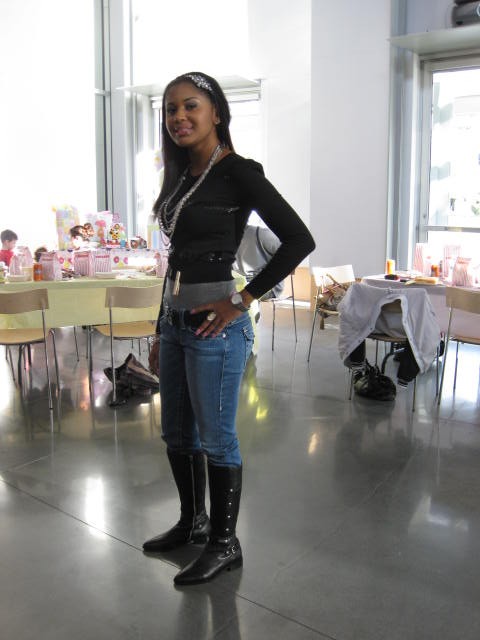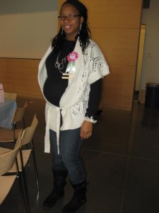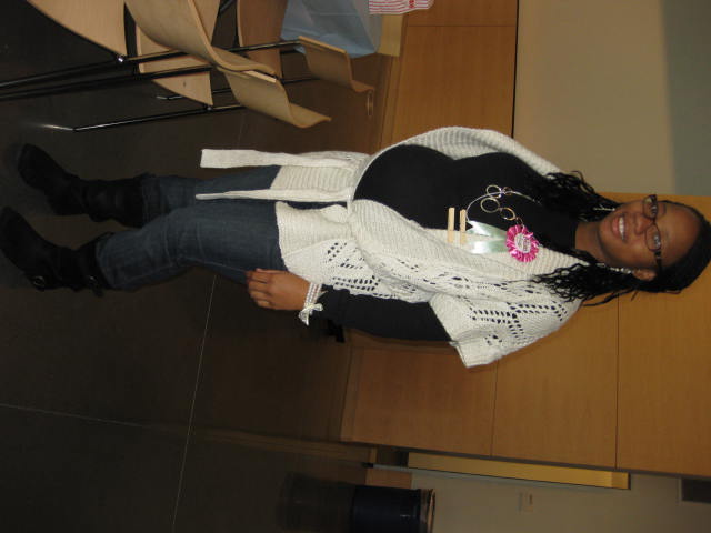 Ceaundra ( Former Mills Student), is a baby shower fashionista that decided to wear All Black Everything. Cece’s key pieces: True Religion Denim, Michael Kors Boot, Black Sweater, Gucci belt, Rhinestone Head piece and pearl necklace. This ensemble was not to bold and yet not a bore either. This is a winter outfit that has mutliple purposes and shows personality — the accessories really made it POP !