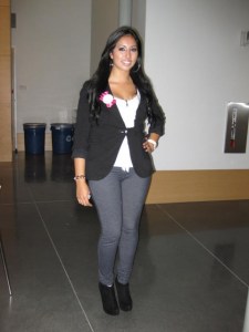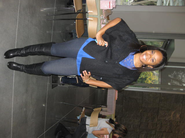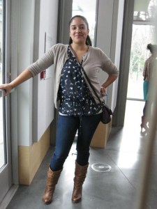 Alejandra ( Mills MBA Student ),  you better work !  I really loved her brown boots and how she paired them with her favorite pair of gap denim. Her blouse and sweater were a great combination because it showed personality while complementing her boot –not overpowering them.
