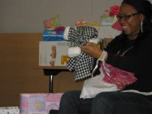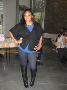 Nicole ( Mills Junior ) is a Baby Shower fashionista in that she wore very important key items during this winter season. The key items : Black sweater, bold blue blouse, jeggings and black knee high boots. Nicole’s ensemble was perfect for a winter day because it had some personality with the bold blue shirt as well as her winter boot. Every fashionista needs a perfect winter boot during this cold and rainy season. Kudos Nicole !