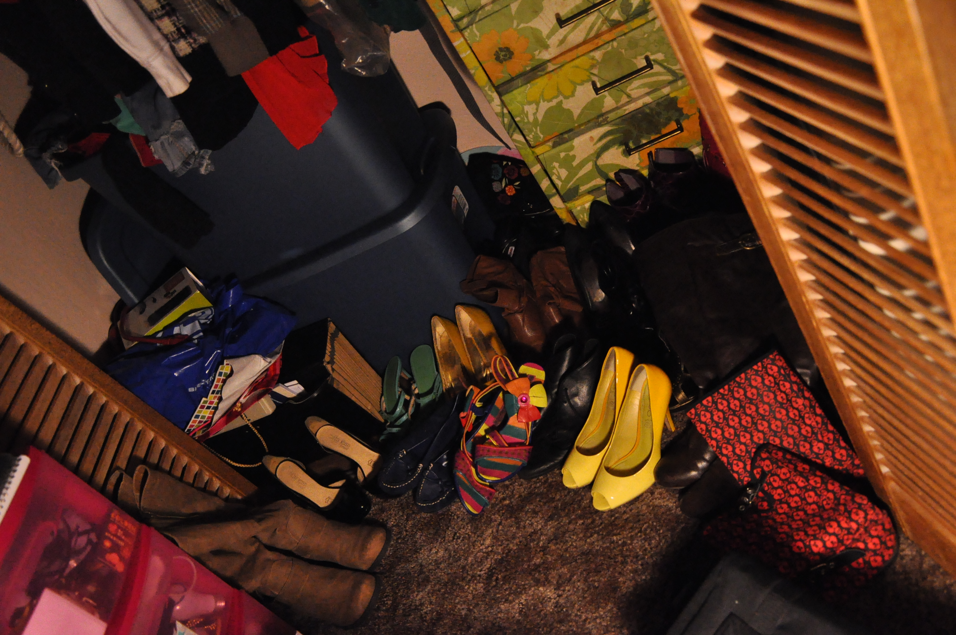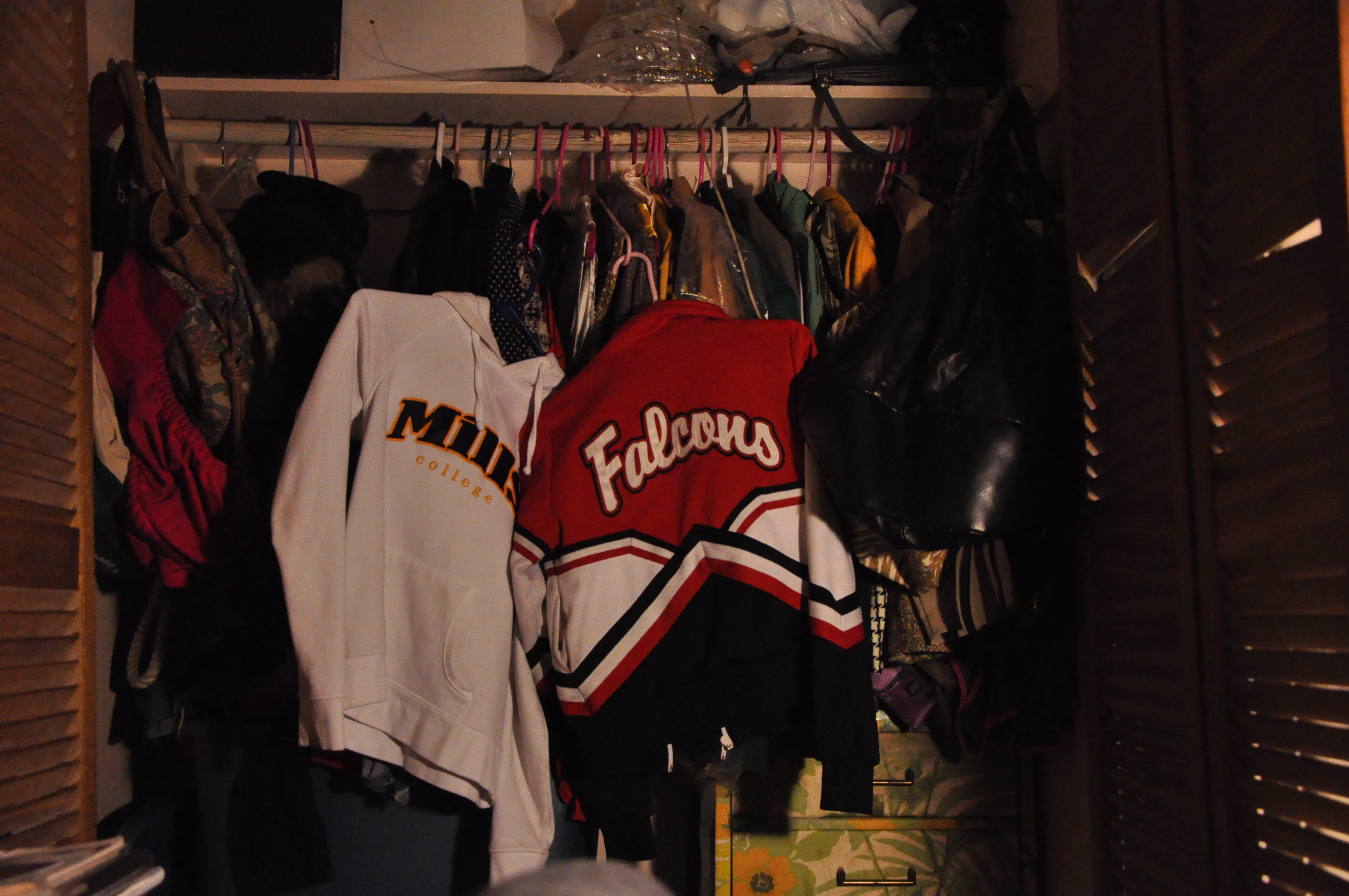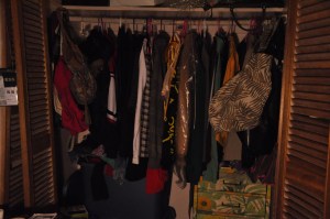 For example, the photos below are of my closet which I use the clothes quite creatively. The closet is has two blue tubs that contain many shirts, jackets and other random clothing pieces. The clothes on pink hangers are shirts, blouses, skirts and slacks. Many of my clothing pieces are from the affordable Forever 21, local thrift shops and my mom’s closet. Honestly, my family is always giving me clothes.