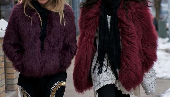 My favorite items in this photo: Black pumps, fur coats, decoratively studded leggings and lace dress.