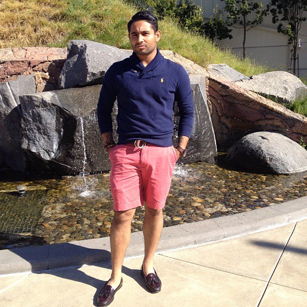 I think that the black and white striped shirt, cobalt colored shorts and black loafers continue to display Jose’s knack for mixing colors as well as high and low brands.