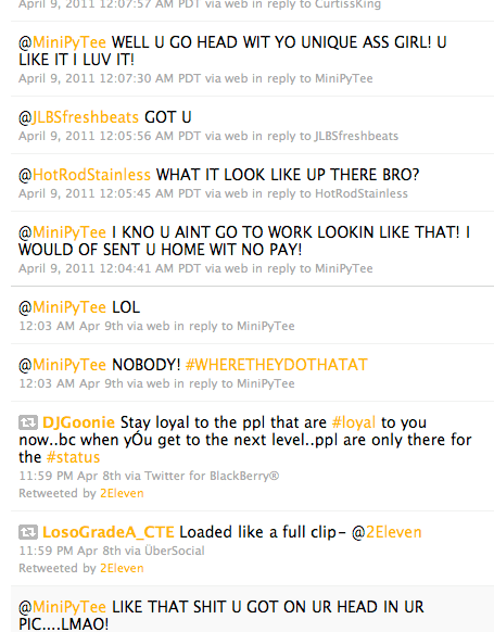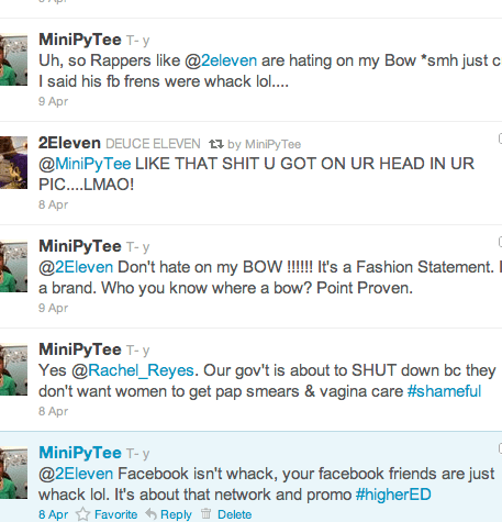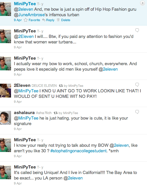 This past weekend on my twitter page, Rapper Young Jeezy‘s L.A. based rap artist, 2Eleven decided to “go in” on my B-O-W. He decided to talk major crap about how my bow was crazy and how he would send me home if he was my boss. I think Rap artist need to have better P.R. people to train them on how to use twitter. Or, they need to stop getting their little feelings hurt behind my snarky comments.