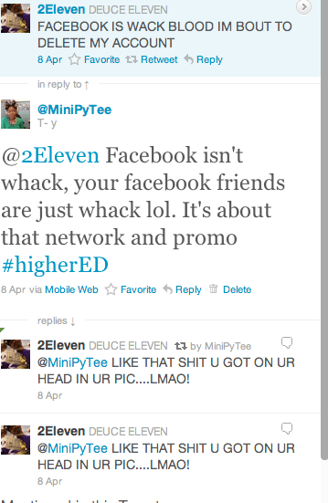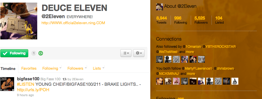 At the end of the day, I understand why he was upset that I talked about his facebook. 2Eleven’s public figure facebook page only has a few hundred likes ( as of 4.11.2011.) So, I ask that people support him so that he can be a happy rapper and non-BOW hater on twitter. LMAO!