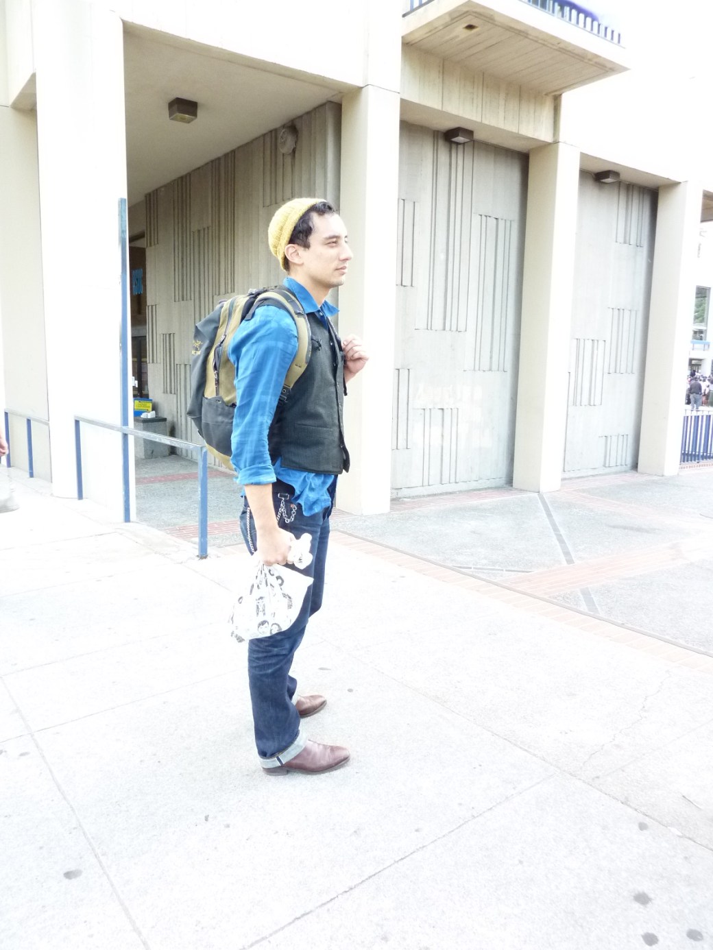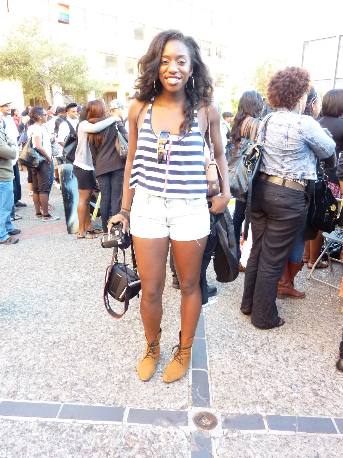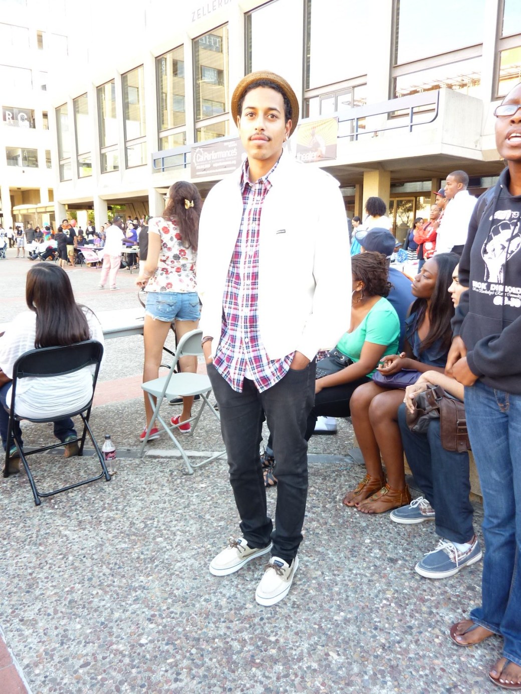 His shirt meant so much to me. In the East Bay, Black men are misrepresented in major media as being savage rapist, murderers and gang affiliated. His ensemble has a message that speaks volumes on who Black men are. Black men are attractive, positive and loving human beings. This photo was taken at the University of California, Berkeley.